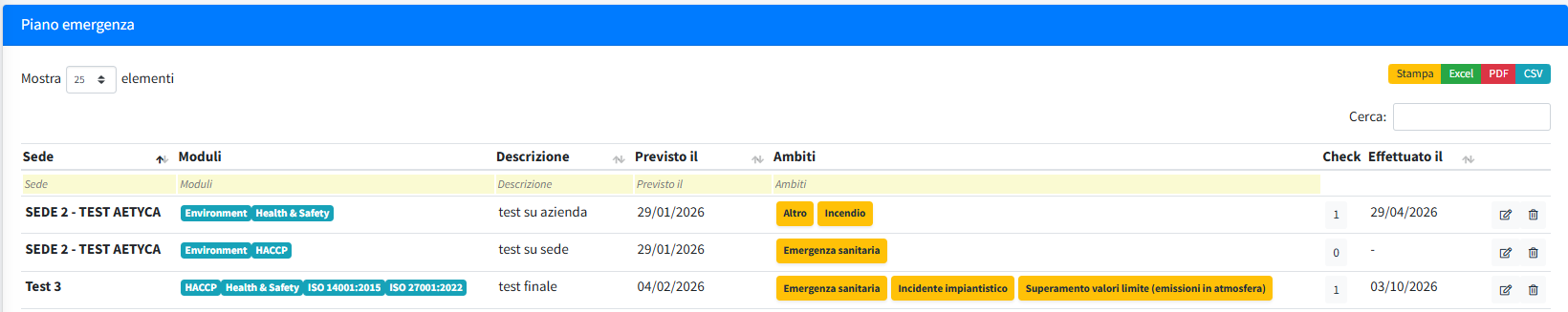 - Una volta salvato, il piano emergenza sarà visibile all'interno della tabella Piano emergenza. Da questa sezione, l'operatore può gestire lo storico delle attività, avendo la possibilità di modificare i dettagli inseriti o eliminare definitivamente i record non più necessari.