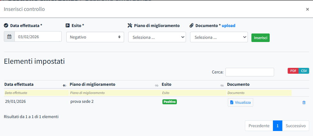 - Per poter inserire un piano di miglioramento durante il controllo (tramite selezione), è necessario averlo prima configurato nella relativa pagina di anagrafica Piano di miglioramento