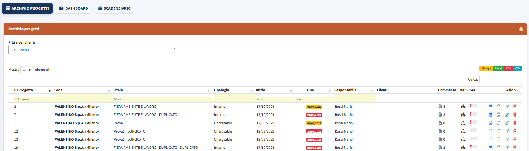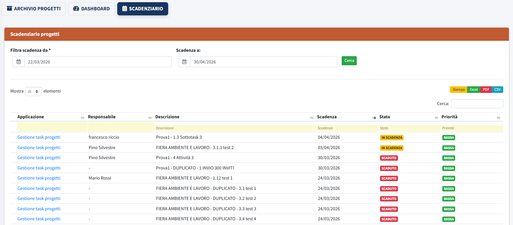 - Attraverso la consultazione dello Scadenziario, è possibile monitorare puntualmente le scadenze relative a ciascuna fase e alle singole attività. Questo strumento permette una visione d'insieme delle deadline imminenti, agevolando il rispetto dei tempi di consegna stabiliti nel piano di progetto.