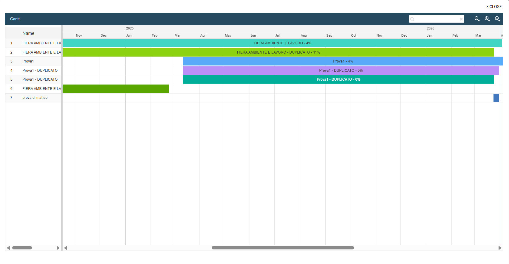 - La visualizzazione del Gantt è disponibile direttamente dall'elenco progetti: individua il progetto desiderato nell'Archivio e clicca sull'icona del calendario situata sulla destra. Questo aprirà la cronoprogrammazione interattiva delle attività.