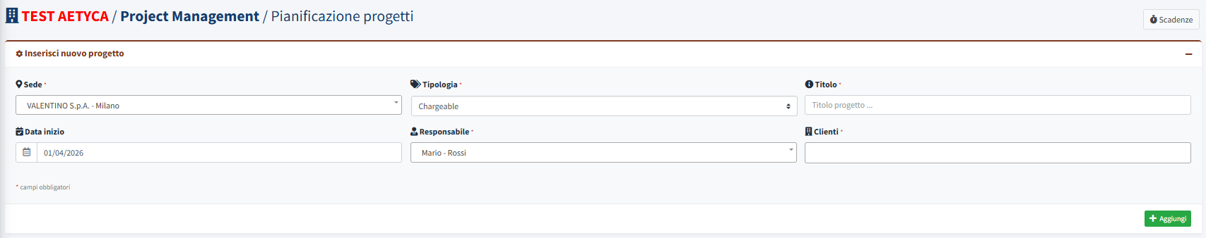 - Per inserire un nuovo progetto, cliccare il tasto + alla destra della voce inserisci nuovo progetto