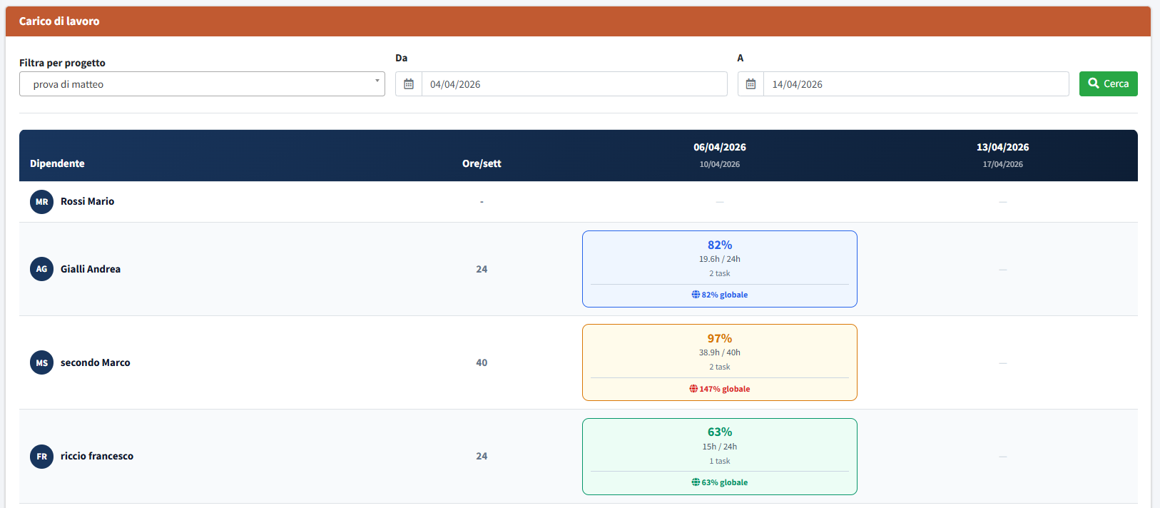 Nota importante: Se la saturazione globale è superiore al 100% (es. il caso di secondo Marco al 147%), il box mostrerà un avviso in rosso: il dipendente è in forte sovraccarico complessivo, anche se sul singolo progetto sembra essere sotto la soglia critica.