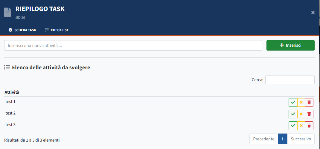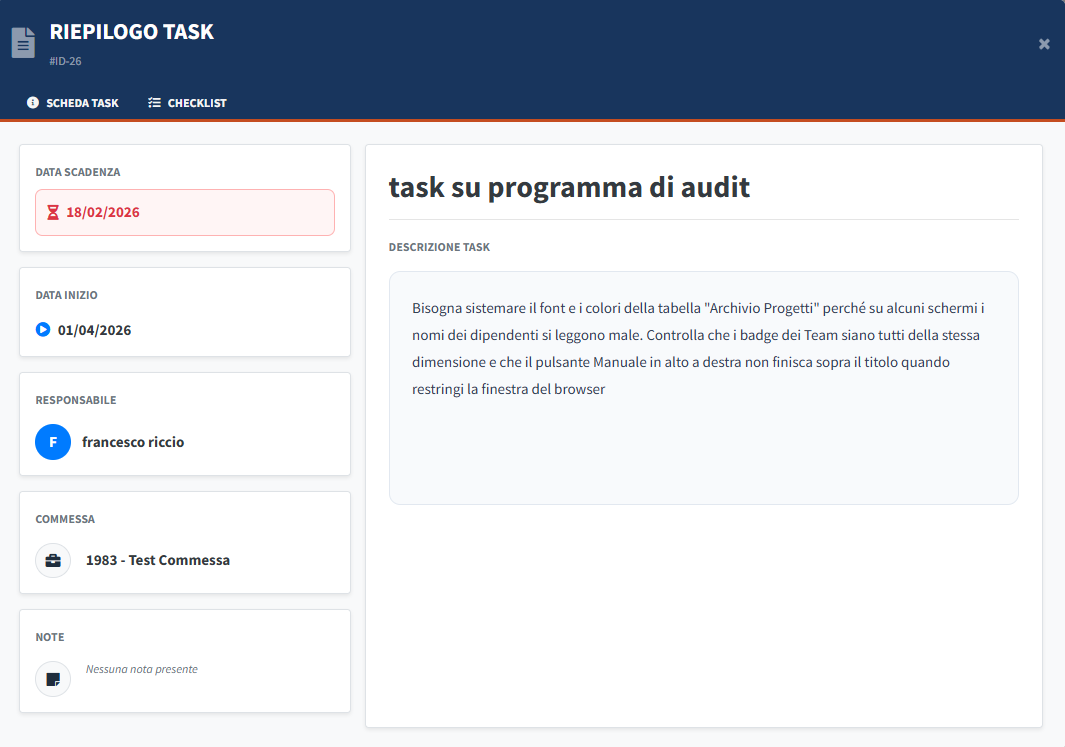 - All'interno della scheda di dettaglio del task, è presente una Checklist operativa. Questa sezione permette di monitorare l'avanzamento delle singole sotto-attività: l'utente può smarcare i punti completati, aggiornando così in tempo reale lo stato di lavorazione del task e fornendo un feedback immediato sulla chiusura dei vari step previsti