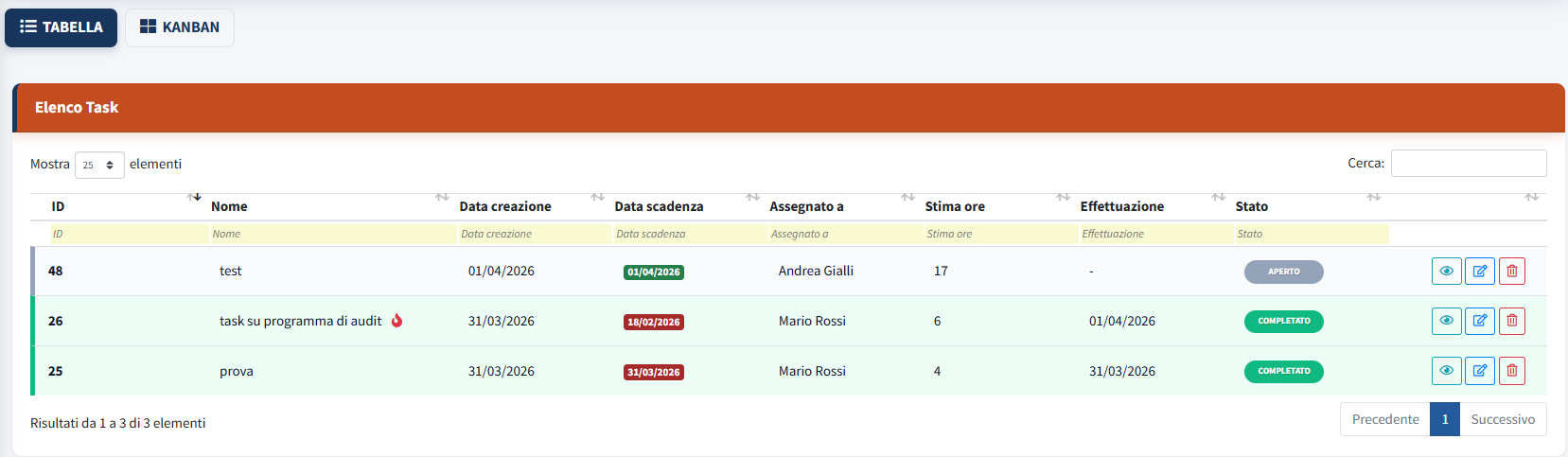 - Una volta registrato, il progetto sarà disponibile nella sezione Elenco task. Da questa dashboard è possibile monitorare l'intero elenco dei Task, accedendo rapidamente alle funzioni di consultazione, modifica o eliminazione dei dati.