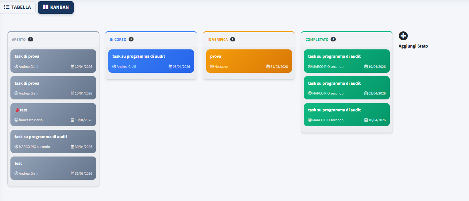 Oltre alla classica gestione tabellare, il sistema offre una Vista Kanban che permette di visualizzare i task suddivisi per colonna in base al loro stato di avanzamento. La piattaforma include 4 stati predefiniti di sistema e consente la configurazione di ulteriori 3 stati personalizzati (custom). Per aggiornare lo stato di un'attività, è sufficiente utilizzare la funzione drag-and-drop, trascinando la card del task dalla colonna di origine a quella di destinazione