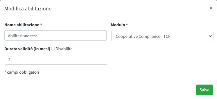 - Gestione Scadenza: Inserire il numero di mesi di validità nel campo “Durata validità”. Se l'abilitazione ha validità permanente (non scade mai), è necessario attivare il toggle (o checkbox) Disabilita posto sopra il campo durata; in questo modo il sistema la gestirà come “Illimitata”.