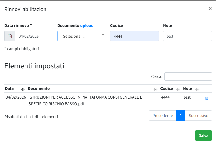 - Calcolo della Scadenza: Il sistema genera automaticamente la nuova data di scadenza sommando il periodo di validità previsto alla data di fine corso inserita.