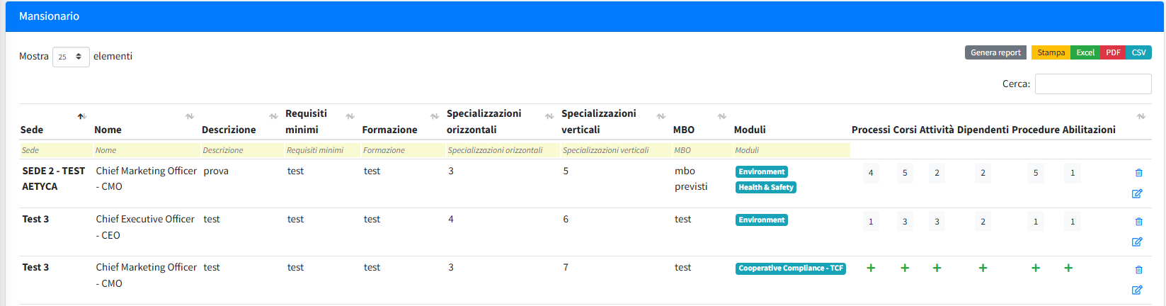 - Una volta salvata, la funzione sarà visibile all'interno della tabella Mansionario. Da questa sezione, l'operatore può gestire lo storico delle attività, avendo la possibilità di modificare i dettagli inseriti o eliminare definitivamente i record non più necessari.