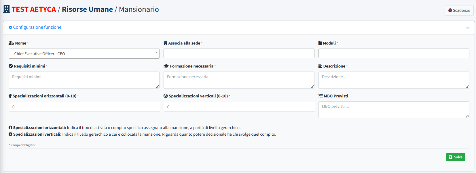 - Per accedere a questa funzionalità selezionare la voce Risorse umane dalla Dashboard principale e accedere alla pagina Mansionario